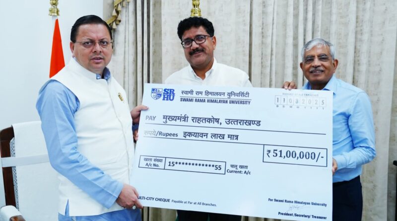 स्वामी राम हिमालयन यूनिवर्सिटी द्वारा उत्तरकाशी जिले के धराली एवं हर्षिल क्षेत्र में आई आपदा के राहत कार्यों के लिए मुख्यमंत्री राहत कोष में 51 लाख रुपए की धनराशि का योगदान दिया गया।